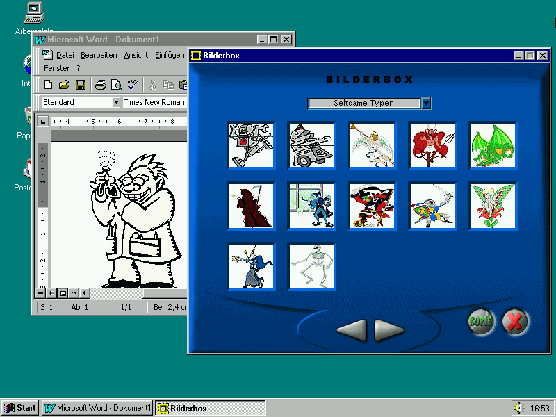 Von den Desktopthemen finden sich Baseball, Dschungel, Unterwasser und Weltraum später bei Windows 98. Exklusiv blieben Baumhaus, Insekten, Pferde, RE-man, Rumpelkammer und Snowboard.