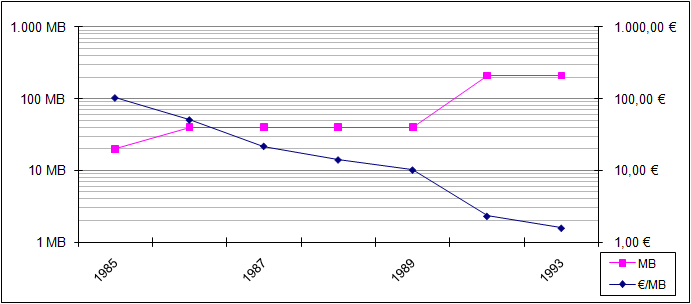 Die erste Grafik beschreibt den Preisverlauf pro Megabyte und die übliche Plattengröße (beides logarithmisch gestaucht). Man musste 1985 für eine 20 Megabyte Festplatte über 2.000 Euro auf den Tisch legen, das sind rund 100 € für das Megabyte, oder 104.000 € für das Gigabyte. 1993 war das Gigabyte auf einer 211 MB großen Platte theoretisch für nur noch 1.617 € zu haben.
