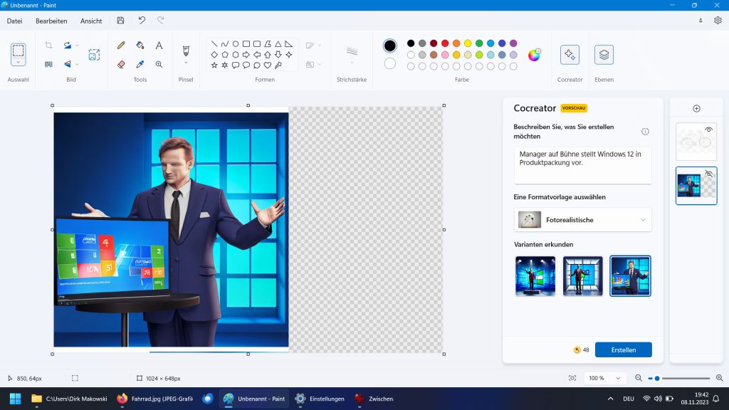 Auch überarbeitet wurde Paint. Dieses kann jetzt mit Ebenen arbeiten, Hintergrund rausrechnen und, wenn man einen Microsoft Account benutzt, KI generierte Bilder erstellen.