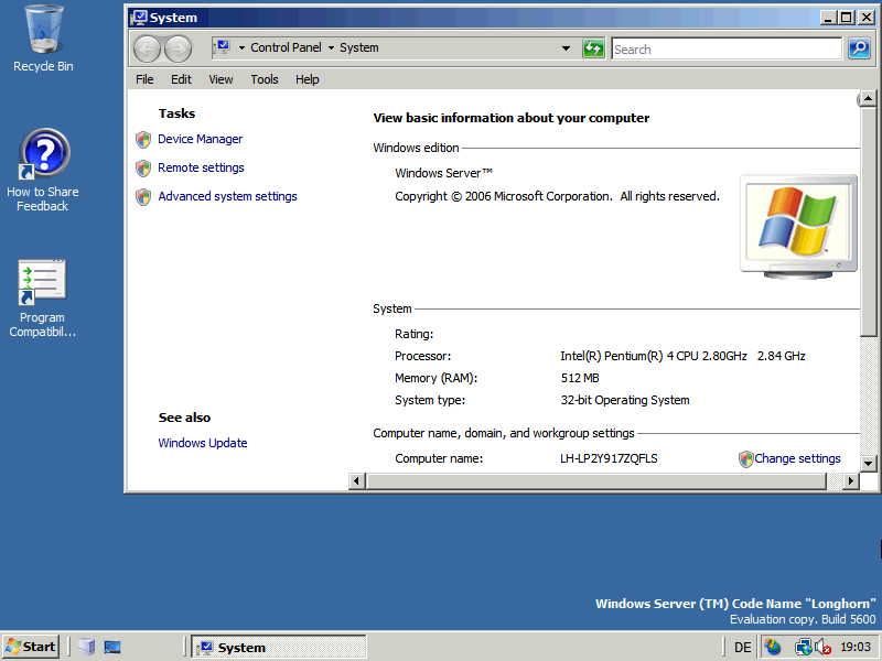Der Bootscreen ist derselbe wie bei Vista, das anschließende Laden der grafischen Oberfläche sieht leicht anders aus. Der Desktop ist wie leergefegt. Bei Windows 2003 R2 gab es neben dem Mülleimer noch eine Serverkonfigurationsverknüpfung. Jetzt gibt es nur noch den hübschen Mülleimer. Von Aero ansonsten keine Spur, "Windows Klassik" ist aktiviert, damit auch keine weiteren Funktionen, wie Fenstervorschau möglich. In der Systeminformation wird ein Servicepack gelistet.