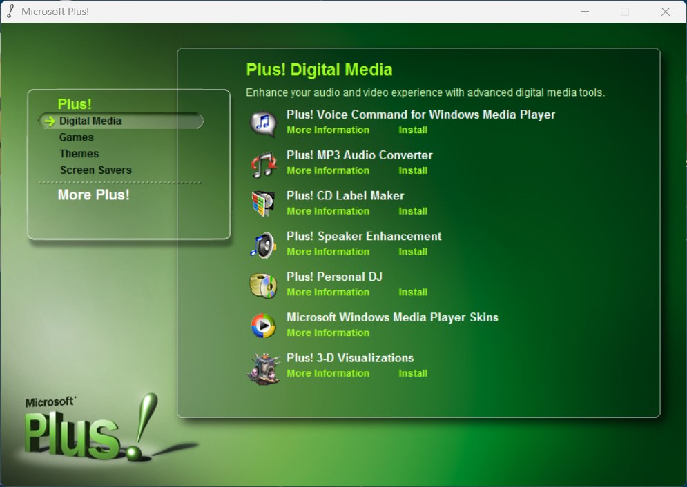 Zusätzlich enthält Windows XP ein neues Desktop Theme "Lichtbogenblau", sowie Themen (Aquarium, Da Vinci, Natur, Weltraum) von Plus!. Auch die Funktionen Audio Konverter, CD Label Beschriftung, Party Modus und Dancer stammen aus diesen Erweiterungen.